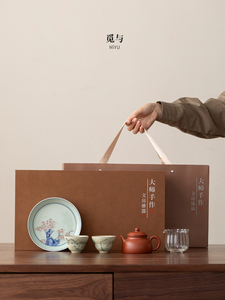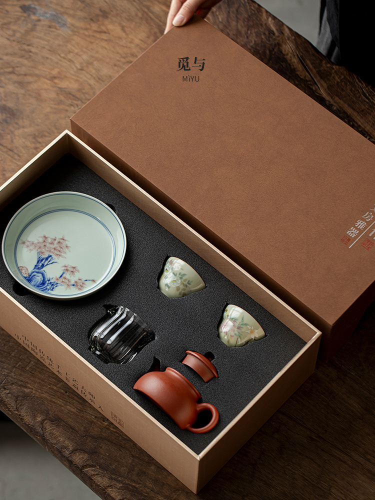 Color Classification: Together with Ru (Purple Sand Zhuni Pan Pot + 2 Ru Kiln Gourd Cups + Hand - painted Pot Holder) [Gift Box Set]