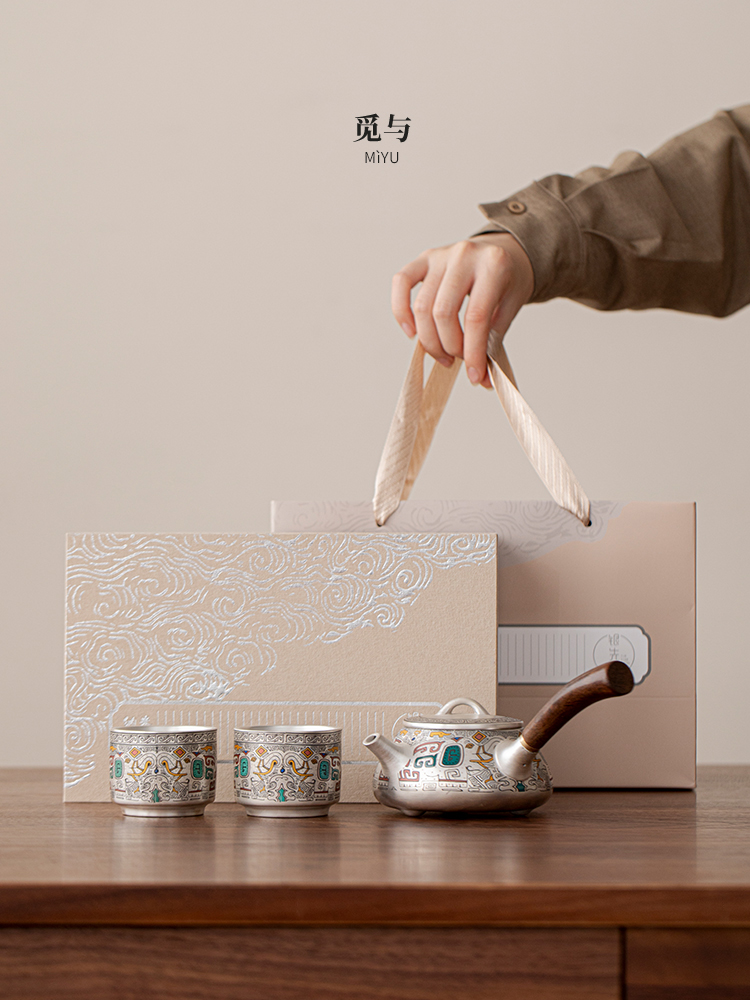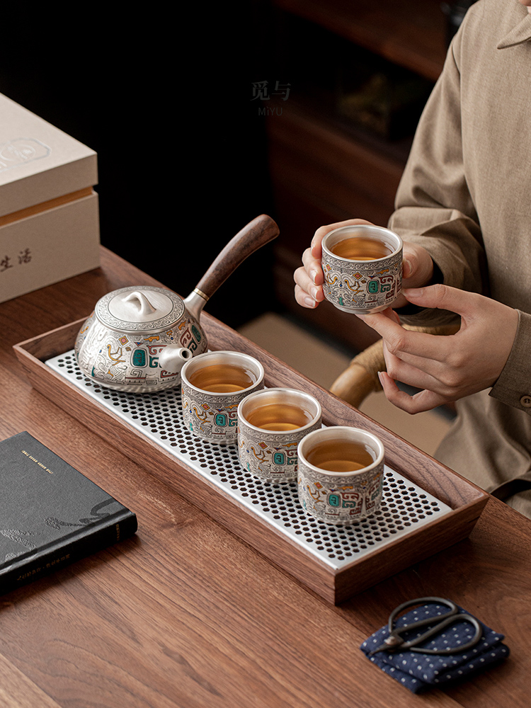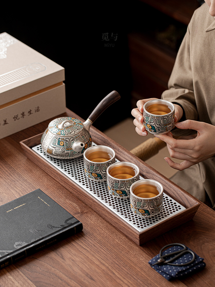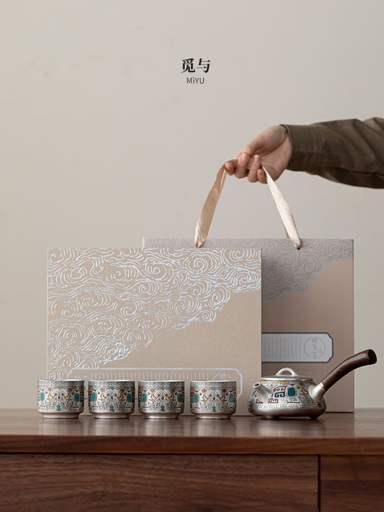 Color Classification: (Gold and Silver Inlay) Ancient - pattern Silver - inlaid Side - handle Pot + 4 Cups [Gift Box Set] (Gold and Silver Inlay) All - things Renewed...