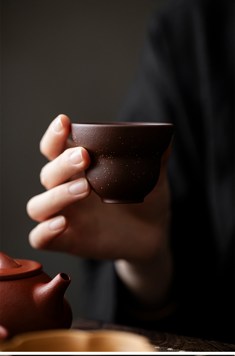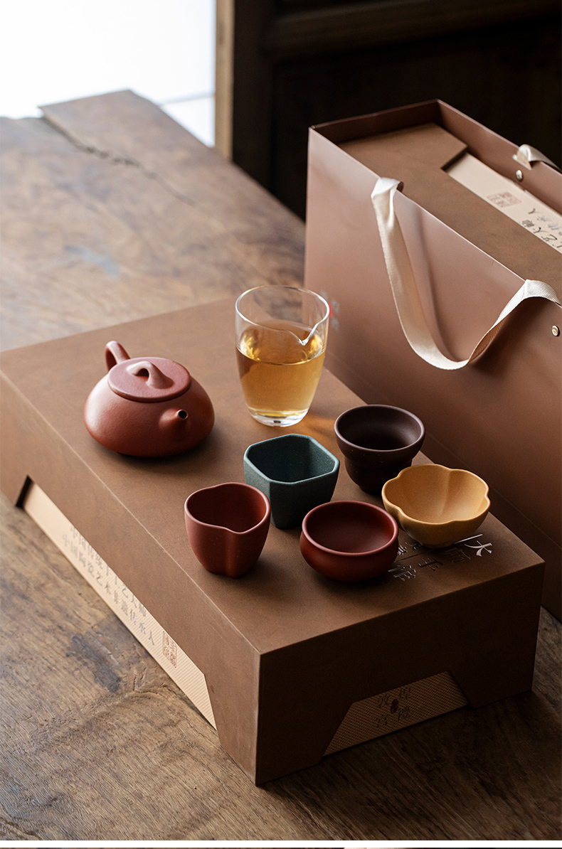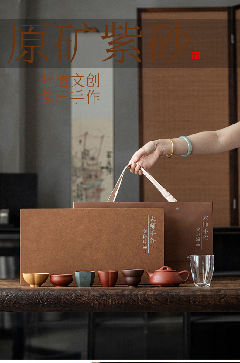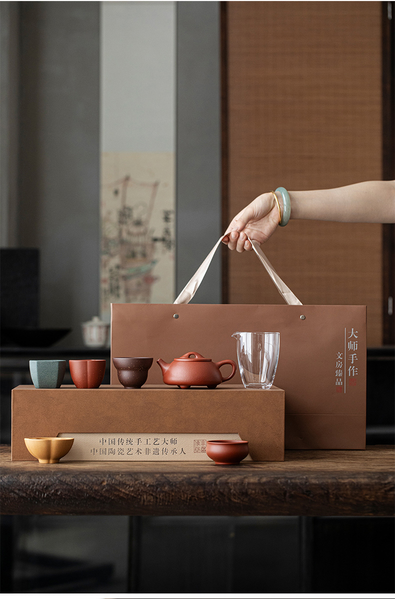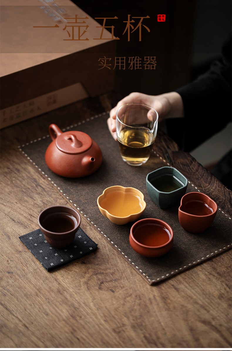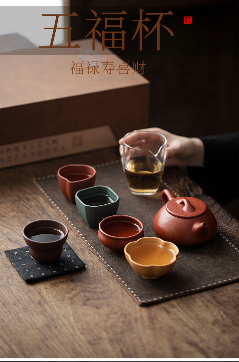 Color Classification: Zisha Stone Gourd Pot 180cc + Five - Blessing Cups (Good Fortune, Emolument, Longevity, Happiness, Wealth) (1 pot 5 cups 1 fair cup) [Gift...