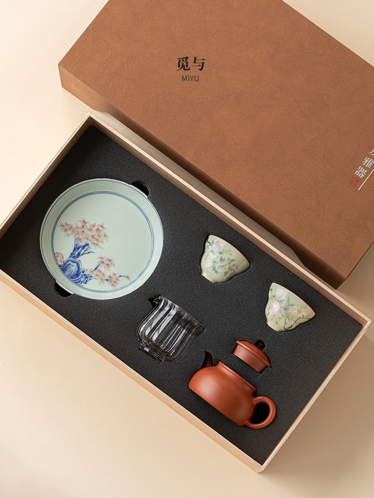 Color Classification: Together with Ru (Purple Sand Zhuni Pan Pot + 2 Ru Kiln Gourd Cups + Hand - painted Pot Holder) [Gift Box Set]
