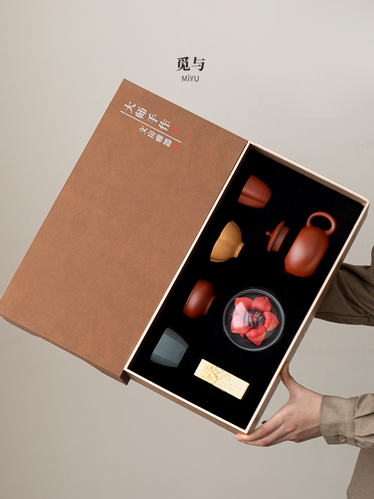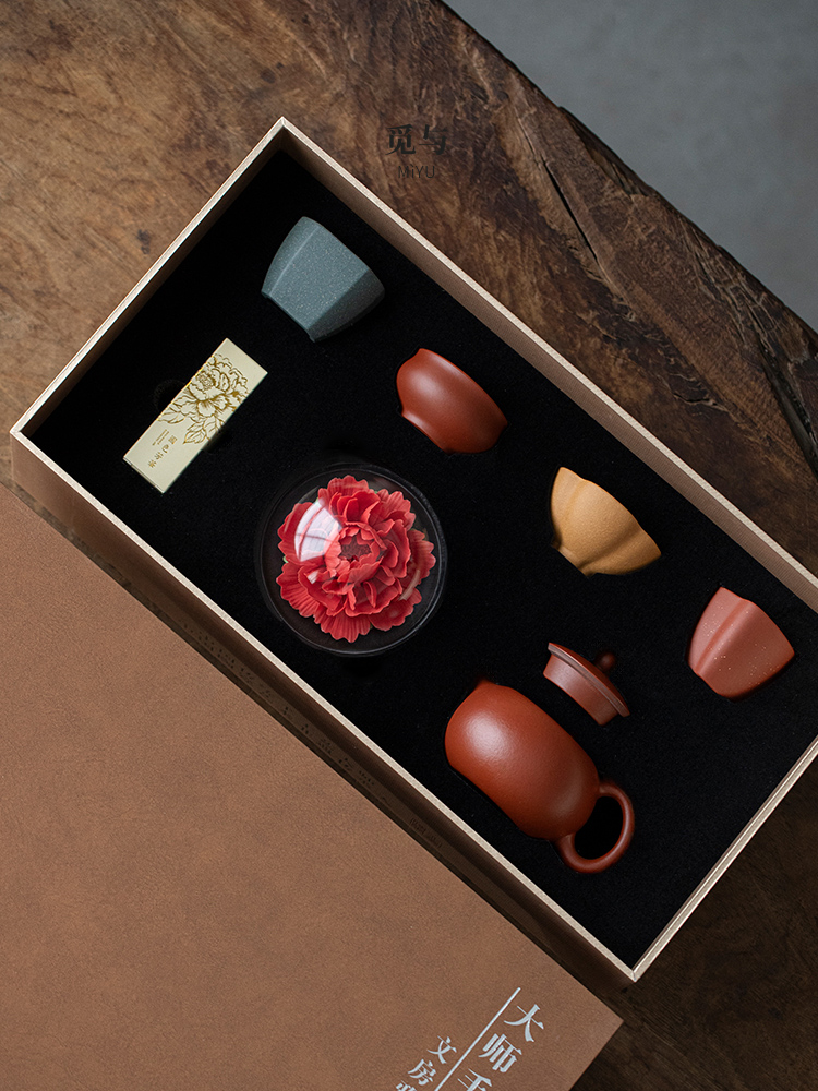 Color Classification: Xishi Pot Five - Blessing Cups (1 pot 5 cups) + Intangible Cultural Heritage Hand - pinched National - color Peony (Fragrant Leaf Package) [Gift Box Set]