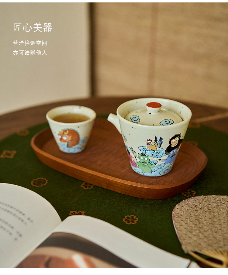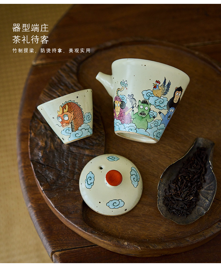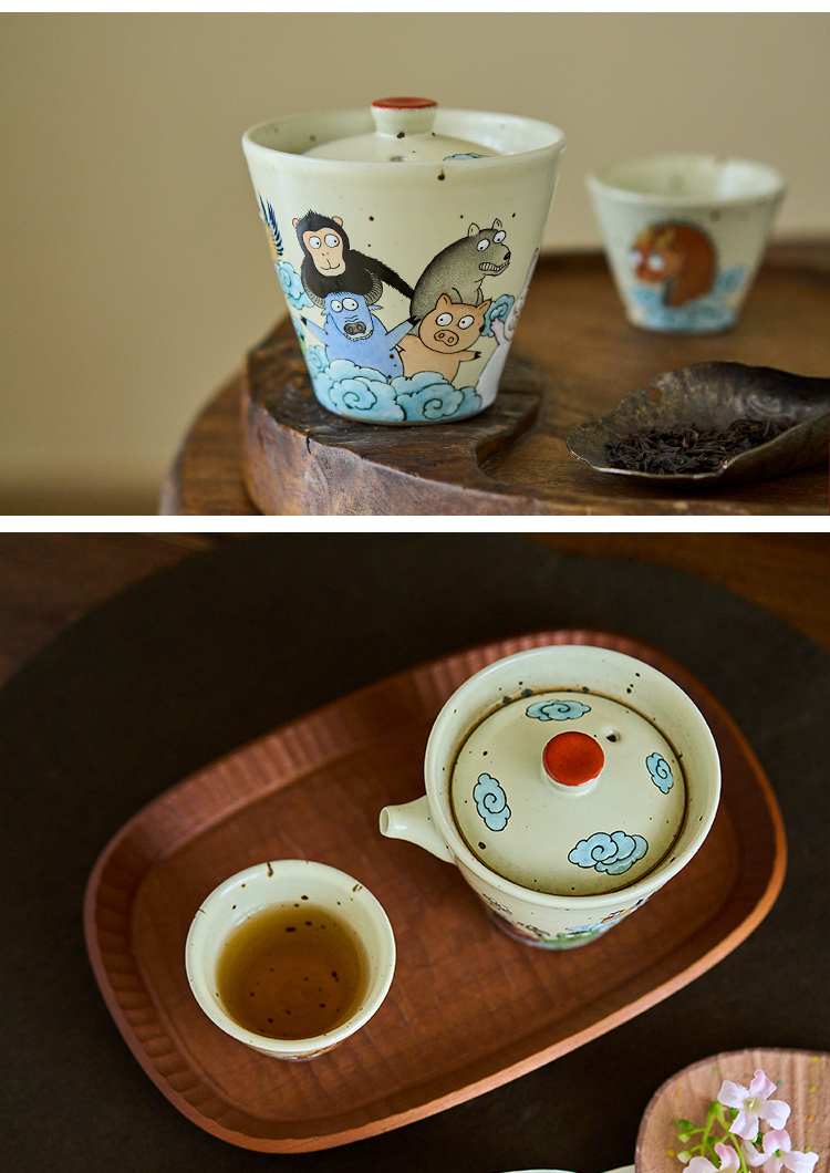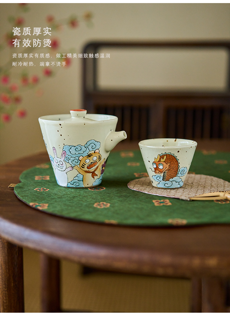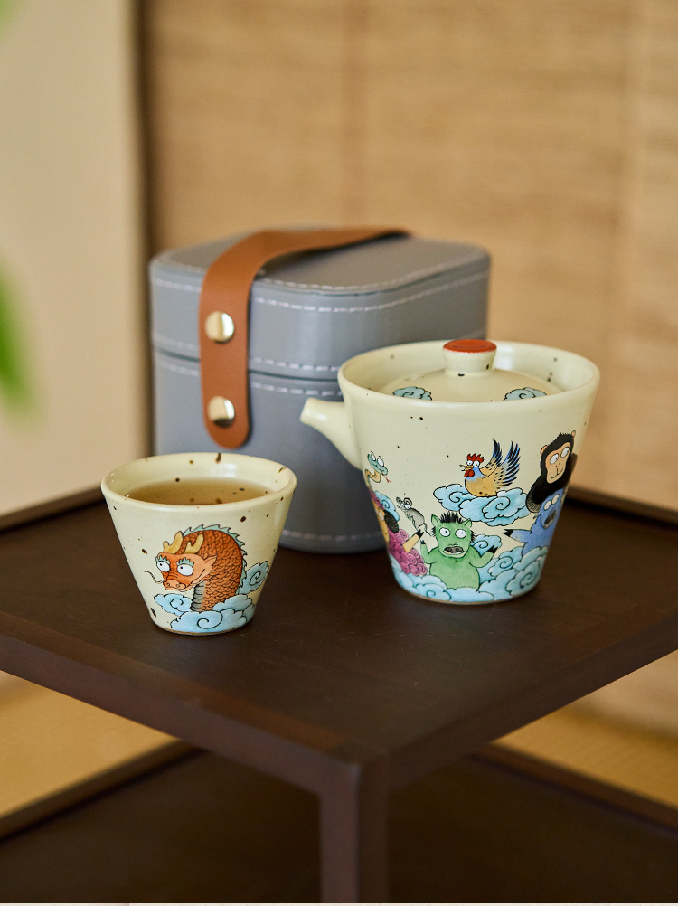 Sketch the original hand-painted zodiac travel tea set, a pot and a cup of Jingdezhen ceramics, a single tea teapot